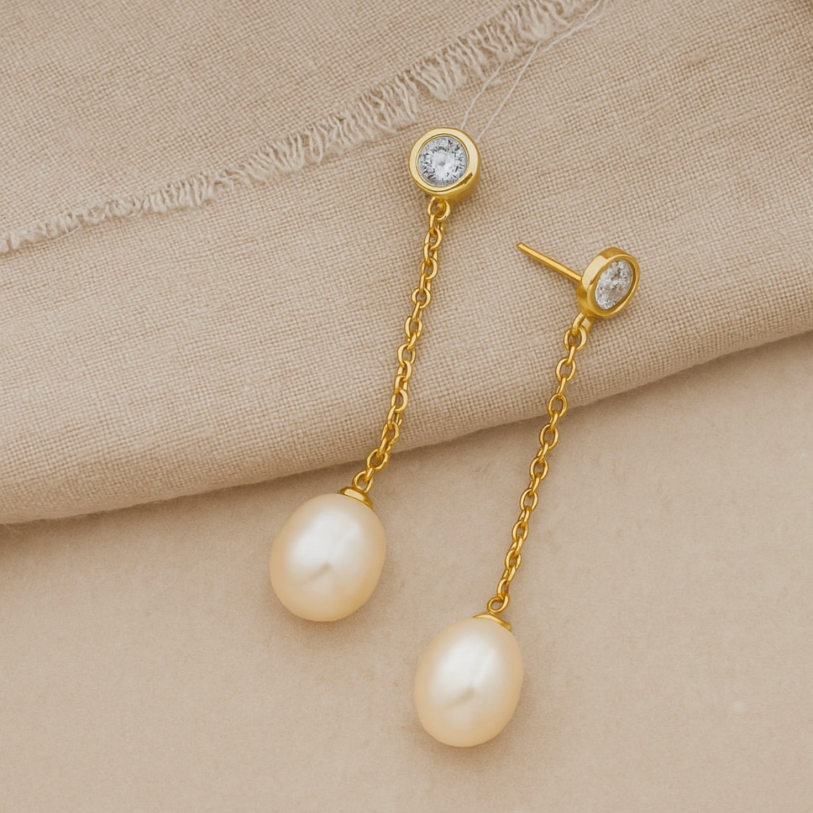 Aros colgantes Perlas y Circón Bisel Plata 925 Bañada en Oro